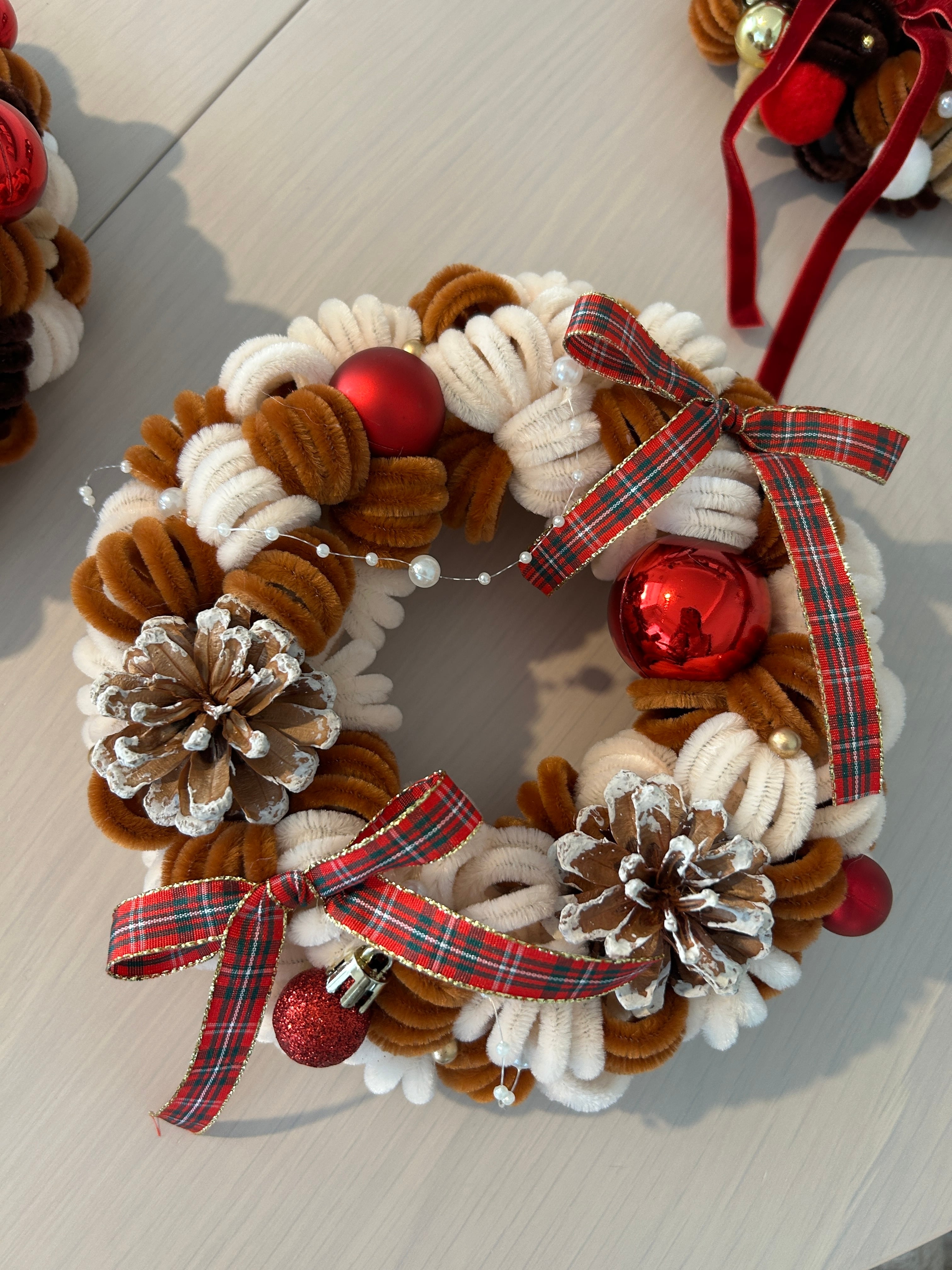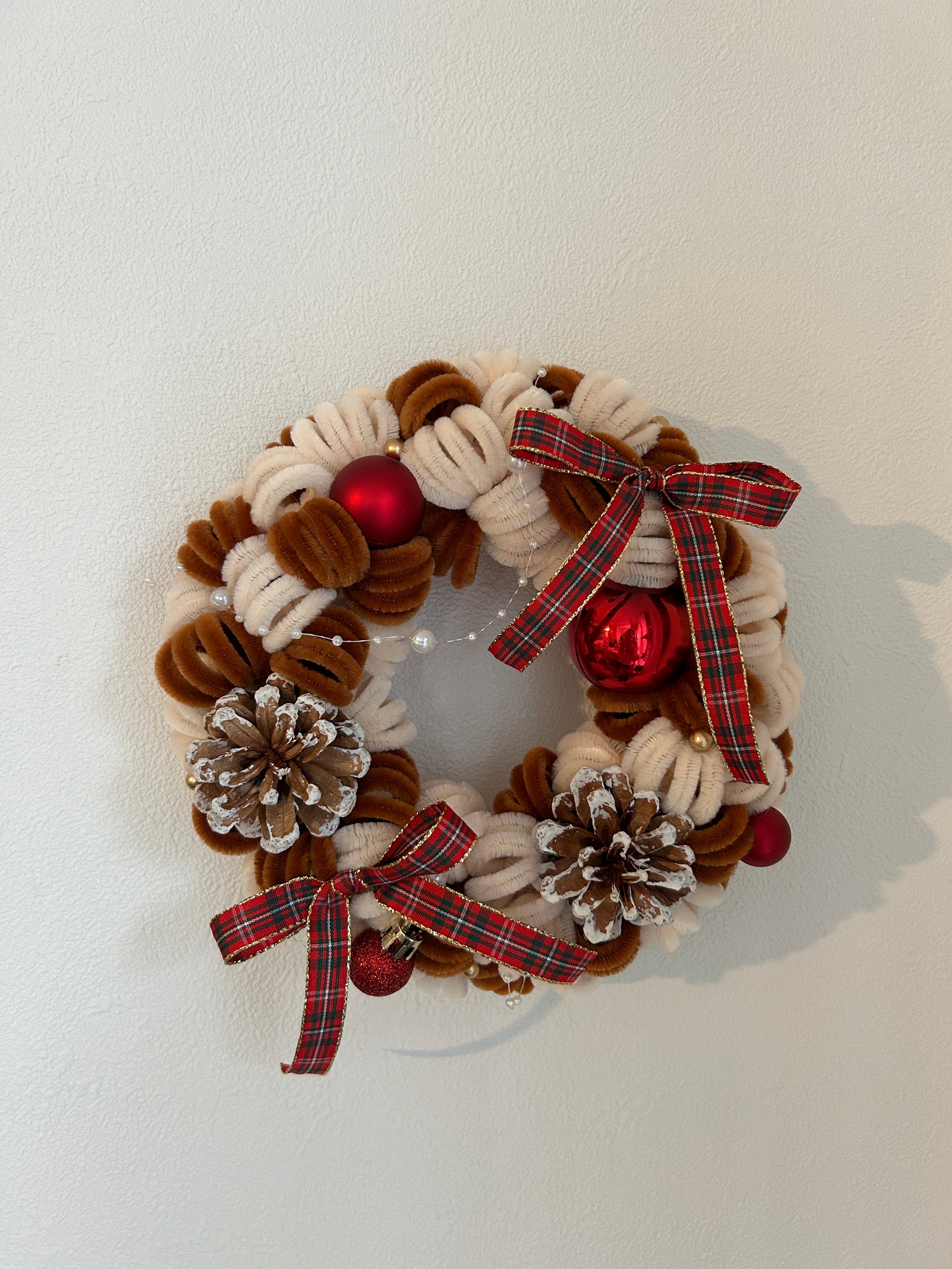 ベージュ×ブラウン×レッドのクリスマスリース。