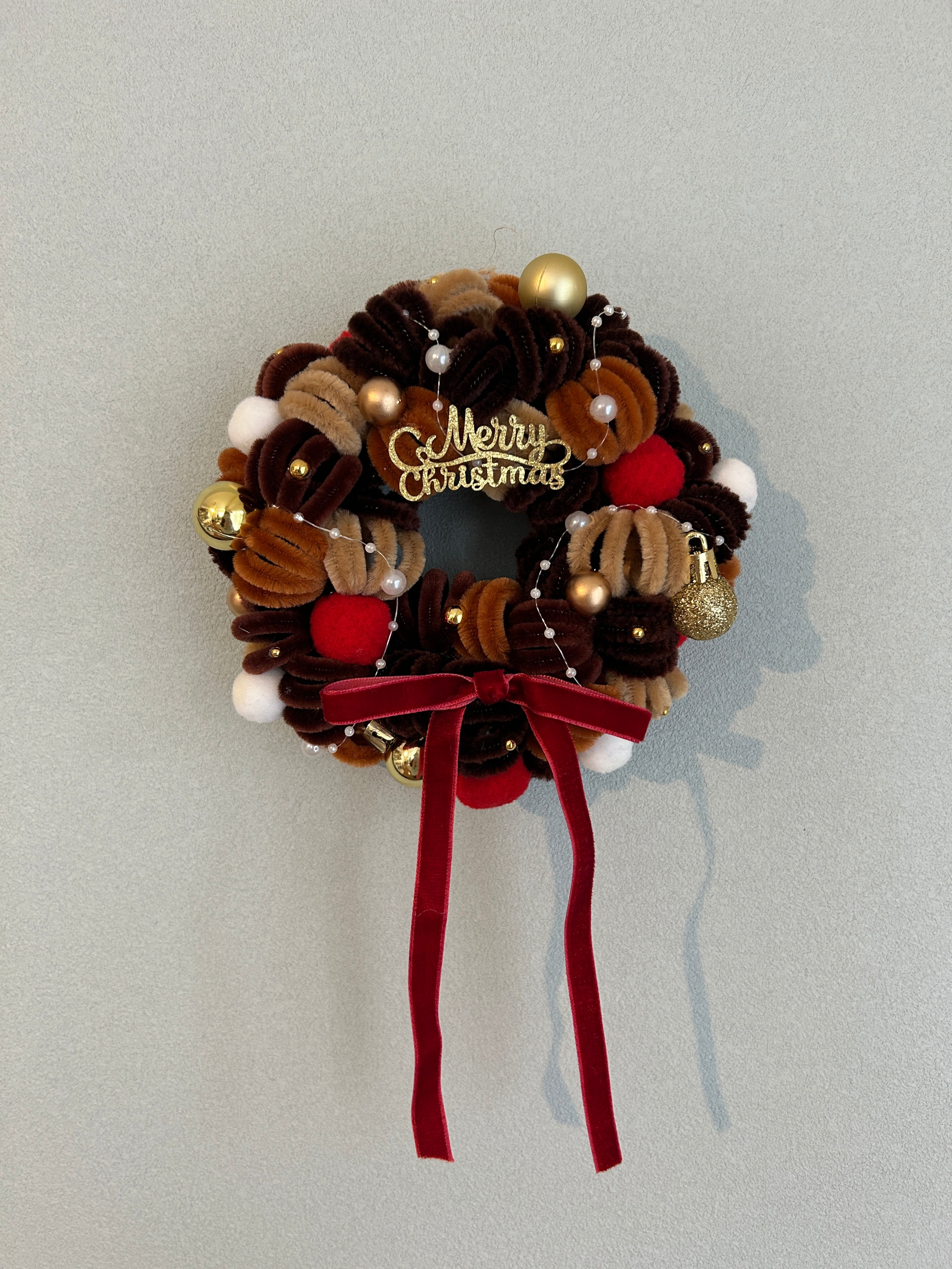 トナカイカラーのクリスマスリース。 ゴールド、レッドのパーツでコンパクトなサイズながら存在感のある一点です。 サイズ:直径約15cm